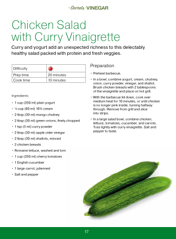 • In a large salad bowl, combine chicken, lettuce, tomatoes, cucumber, and carrots. Toss lightly with curry vinaigrette. Salt and pepper to taste.