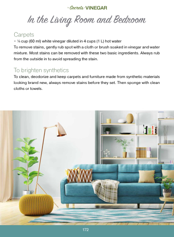 To clean, deodorize and keep carpets and furniture made from synthetic materials looking brand new, always remove stains before they set. Then sponge with clean cloths or towels.