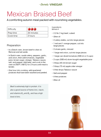 • In Dutch oven, sauté celery, peppers, garlic, and onion, then add tomatoes, vegetable juice, brown sugar, vinegar, Tabasco sauce, salt, and pepper. Add beef, and cook in the oven at 350°F (180°C) for 2 hours until meat is tender.