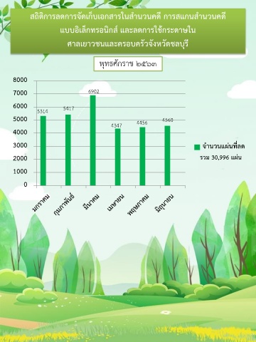 สถิติการลดการจัดเก็บเอกสารในส านวนคดี การสแกนส านวนคดี แบบอิเล็กทรอนิกส์ และลดการใช้กระดาษใน ศาลเยาวชนและครอบครัวจังหวัดชลบุรี พุทธศักราช 2563 8000 7000 6902 6000 5417 5314 5000 4560 4347 4456 4000 3000 จ านวนแผ่นที่ลด 2000 รวม 30,996 แผ่น 1000 0