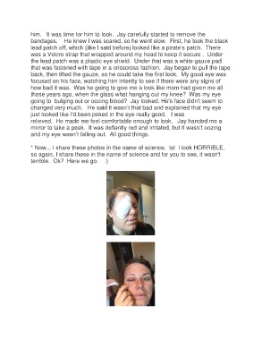 back, then lifted the gauze, so he could take the first look. My good eye was