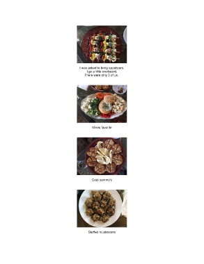 I was asked to bring appetizers. I go a little overboard. There were only 3 of us. Mikes favorite Crab yummy's Stuffed mushrooms
