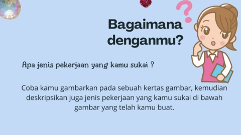 Bagaimana denganmu? Apa jenis pekerjaan yang kamu sukai ? Coba kamu gambarkan pada sebuah kertas gambar, kemudian deskripsikan juga jenis pekerjaan yang kamu sukai di bawah gambar yang telah kamu buat.