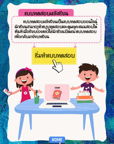แบบทดสอบหลงเรยน ั ี แบบทดสอบหลังเรียนเป็นแบบทดสอบออนไลน ์ นักเรียนสามารถทําแบบทดสอบและดูผลคะแนนสอบได ้ ทันที เมื่อเรียบร้อยแล้วให้นักเรียนปิดหน้าแบบทดสอบ เพื่อกลับมายังบทเรียน เริ่มทําแบบทดสอบ EBOOK
