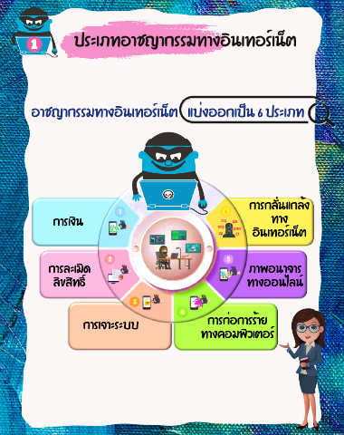 ประเภทอาชญากรรมทางอินเทอร์เน็ต อาชญากรรมทางอินเทอร์เน็ต แบ่งออกเป็น 6 ประเภท การกลั่นแกล้ง การเงิน ทาง อินเทอร์เน็ต การละเมิด ภาพอนาจาร ลิขสิทธ ิ์ ทางออนไลน ์ การก่อการร้าย การเจาะระบบ ทางคอมพิวเตอร ์