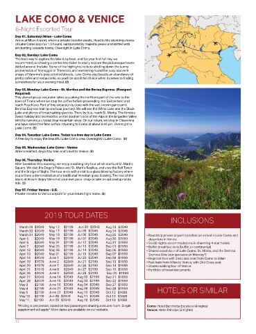 April 12 $2049 May 26 $2199 Jul 14 $2049 Sep 06 $1959 • Shared coach tour of Lake Como, St. Moritz, and the Bernina