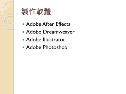 製作軟體 Adobe After Effects Adobe Dreamweaver Adobe Illustrator Adobe Photoshop
