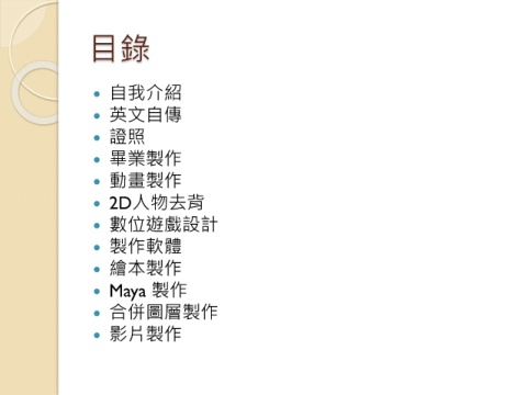 目錄 自我介紹 英文自傳 證照 畢業製作 動畫製作 2D人物去背 數位遊戲設計 製作軟體 繪本製作 Maya 製作 合併圖層製作 影片製作