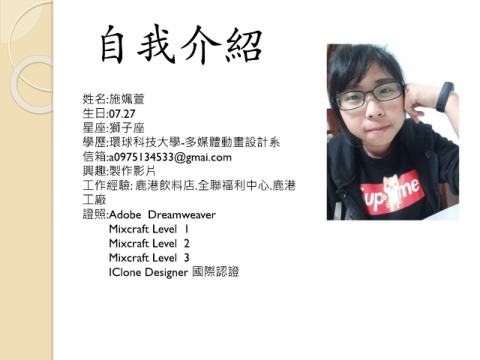 姓名:施姵萱 生日:07.27 星座:獅子座 學歷:環球科技大學-多媒體動畫設計系 信箱:a0975134533@gmai.com 興趣:製作影片 工作經驗: 鹿港飲料店.全聯福利中心.鹿港 工廠 證照:Adobe Dreamweaver Mixcraft Level 1 Mixcraft Level 2 Mixcraft Level 3 IClone Designer 國際認證