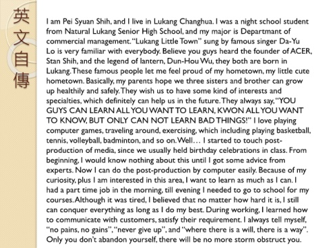 英 I am Pei Syuan Shih, and I live in Lukang Changhua. I was a night school student
