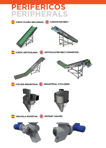 PERIFÉRICOS IMÁGENES MAQUINARIA PERIPHERALS CINTA PLANA INCLINADA CONVEYOR BELT CINTA ARTICULADA ARTICULATED BELT CONVEYOR CICLÓN INDUSTRIAL INDUSTRIAL CYCLONES VÁLVULA ROTATIVA ROTARY VALVES