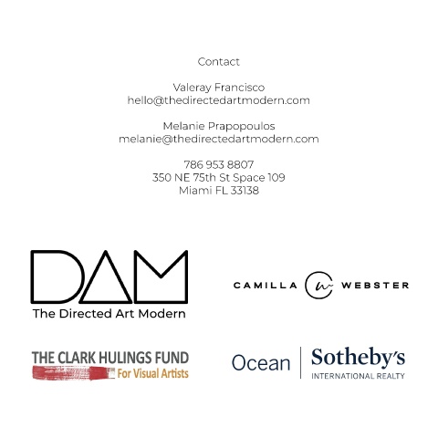 Contact Valeray Francisco hello@thedirectedartmodern.com Melanie Prapopoulos melanie@thedirectedartmodern.com 786 953 8807 350 NE 75th St Space 109 Miami FL 33138 The Directed Art Modern