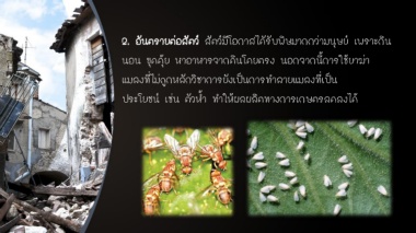 2. อันตรายต่อสัตว์ สัตว์มีโอกาสไดัรับพิษมากกว่ามนุษย์ เพราะกิน นอน ขุดคุ้ย หาอาหารจากดินโดยตรง นอกจากนี้การใช้ยาฆ่า แมลงที่ไม่ถูกหลักวิชาการยังเป็นการท าลายแมลงที่เป็น ประโยชน์ เช่น ตัวห้ า ท าให้ผลผลิตทางการเกษตรลดลงได้