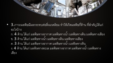 • 3.ภาวะมลพิษมีผลกระทบต่อสิ่งแวดล้อม ท าให้เกิดมลพิษกี่ด้าน ที่ส าคัญได้แก่