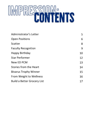 Administrator’s Letter 5 Open Positions 6 Scatter 8 Faculty Recognition 9 Happy Birthday 10 Star Performer 12 New ED PCM 13 Stories from the Heart 14 Bivarus Trophy Winner 15 From Weight to Wellness 16 Build a Better Grocery List 17