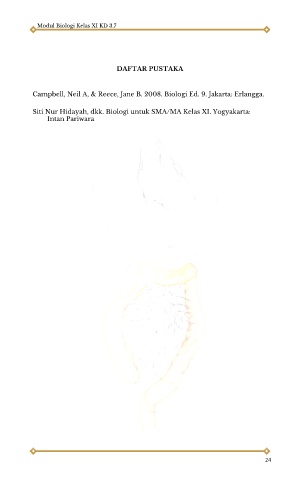 Modul Biologi Kelas XI KD 3.7 DAFTAR PUSTAKA Campbell, Neil A, & Reece, Jane B. 2008. Biologi Ed. 9. Jakarta: Erlangga. Siti Nur Hidayah, dkk. Biologi untuk SMA/MA Kelas XI. Yogyakarta: Intan Pariwara 24