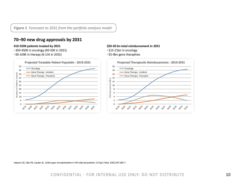 Figure 1 Forecasts to 2031 from the portfolio analysis model 70–90 new drug approvals by 2031 410-550K patients treated by 2031 • 350-450K in oncology (40-50K in 2031) • 60-100K in therapy (6-11K in 2031) $20-30 bn total reimbursement in 2031 • $15-21bn in oncology • $5-9bn gene theraphies Projected Therapeutic Reimbusements - 2019-2031 50 45 40 35 30 25 20 15 10 Projected Treatable Patient Populatin - 2019-2031 Oncology Gene Therapy - Incident Gene Therapy - Prevalent 20 Oncology 18 Gene Therapy - Incident 16 Gene Therapy - Prevalent 14 12 10 8 6 4 52 00 Halpern SD, Ubel PA, Caplan AL. Solid-organ transplantation in HIV-infected patients. N Engl J Med. 2002;347:284-7. CONFIDENTIAL - FOR INTERNAL USE ONLY: DO NOT DISTRIBUTE 10 Number of Patients Treated Reimbursement ($bn) 2019 2020 2021 2022 2023 2024 2025 2026 2027 2028 2029 2030 2031 2019 2020 2021 2022 2023 2024 2025 2026 2027 2028 2029 2030 2031