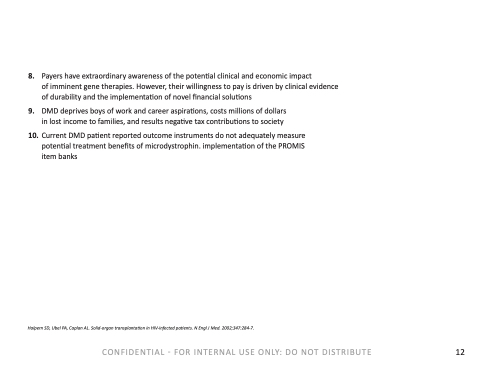 8. Payers have extraordinary awareness of the potential clinical and economic impact of imminent gene therapies. However, their willingness to pay is driven by clinical evidence of durability and the implementation of novel financial solutions 9. DMD deprives boys of work and career aspirations, costs millions of dollars in lost income to families, and results negative tax contributions to society 10. Current DMD patient reported outcome instruments do not adequately measure potential treatment benefits of microdystrophin. implementation of the PROMIS item banks Halpern SD, Ubel PA, Caplan AL. Solid-organ transplantation in HIV-infected patients. N Engl J Med. 2002;347:284-7. CONFIDENTIAL - FOR INTERNAL USE ONLY: DO NOT DISTRIBUTE 12