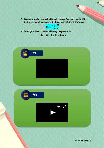 7. Besarnya medan magnet ditengah-tengah Toroida ( pada titik- titik yang berada pada garis lingkaran merah) dapat dihitung : = . 8. Besar gaya Lorentz dapat dihitung dengan rumus : FL = I . ℓ . B . Sin θ FYI FYI MEDAN MAGNET | 21