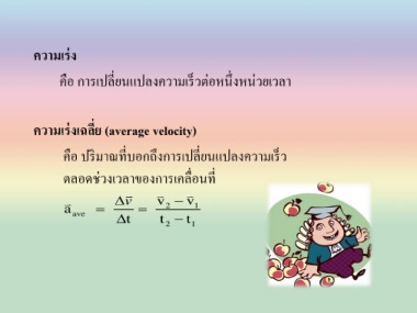 ควำมเร่ง คือ การเปลี่ยนแปลงความเร็วต่อหนึ่งหน่วยเวลา ควำมเร่งเฉลี่ย (average velocity) คือ ปริมาณที่บอกถึงการเปลี่ยนแปลงความเร็ว ตลอดช่วงเวลาของการเคลื่อนที่ v v v a 2 1 ave t t 2 t 1