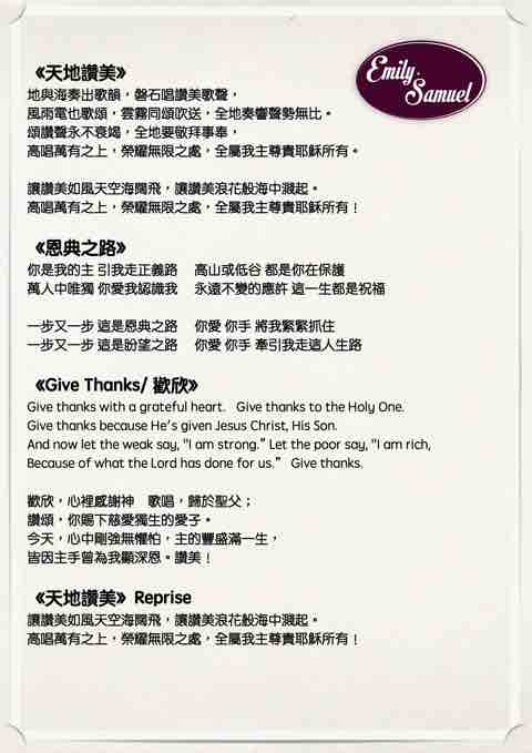 讓讚美如風天空海闊飛,讓讚美浪花般海中濺起。 高唱萬有之上,榮耀無限之處,全屬我主尊貴耶穌所有!