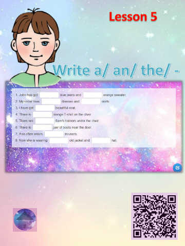 1. This dress is long. 2. like that sweater. 3. Masha wears these trainers for walks. 4. Those jeans are expensive. 5. I’ve got a brown jacket. 6. I’m at the shop now. 7. You can wear these boots in summer. 8. Betsy has got twenty dresses.