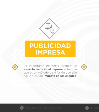 Es importante mantener siempre el aspecto tradicional impreso activo, ya que es un método de difusión que aún sigue creando impacto en los clientes. (55) 8597 9166 · (55) 1078 9409 @Aequ usPublicidad