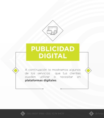A continuación te mostramos algunos de los servicios que tus clientes pueden utilizar o necesitar en plataformas digitales. (55) 8597 9166 · (55) 1078 9409 @Aequ usPublicidad