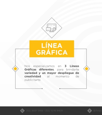 Nos especializamos en 3 Líneas Gráficas diferentes, para brindarte variedad y un mayor despliegue de creatividad al momento de publicitarte. (55) 8597 9166 · (55) 1078 9409 @Aequ usPublicidad