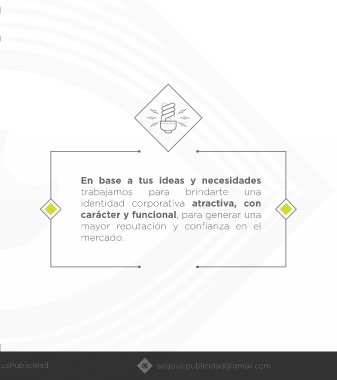 En base a tus ideas y necesidades trabajamos para brindarte una identidad corporativa atractiva, con carácter y funcional, para generar una mayor reputación y confianza en el mercado. @Aequ usPublicidad aequus.publicidad@gmail.com