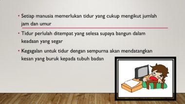 • Setiap manusia memerlukan tidur yang cukup mengikut jumlah jam dan umur • Tidur perlulah ditempat yang selesa supaya bangun dalam keadaan yang segar • Kegagalan untuk tidur dengan sempurna akan mendatangkan kesan yang buruk kepada tubuh badan
