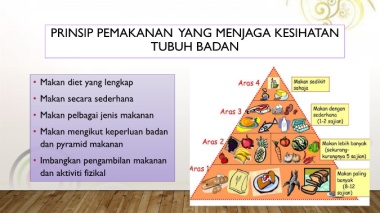 PRINSIP PEMAKANAN YANG MENJAGA KESIHATAN TUBUH BADAN • Makan diet yang lengkap • Makan secara sederhana • Makan pelbagai jenis makanan • Makan mengikut keperluan badan dan pyramid makanan • Imbangkan pengambilan makanan dan aktiviti fizikal