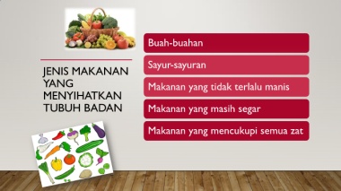 Buah-buahan Sayur-sayuran JENIS MAKANAN YANG Makanan yang tidak terlalu manis MENYIHATKAN TUBUH BADAN Makanan yang masih segar Makanan yang mencukupi semua zat