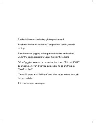 “Wow!” giggled Wee as he arrived at the doors. “This hat REALLY IS amazing! I never dreamed I’d be able to do anything as BRAVE as that!”