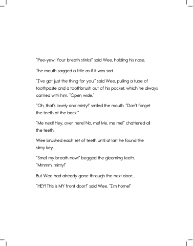 “I’ve got just the thing for you,” said Wee, pulling a tube of toothpaste and a toothbrush out of his pocket, which he always carried with him. “Open wide.”