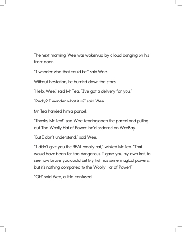 “Thanks, Mr Tea!” said Wee, tearing open the parcel and pulling out ‘The Woolly Hat of Power’ he’d ordered on WeeBay.