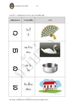 ภาษากลุ่มประชาคมอาเซียน 22 ตารางที่ 1.2 พยัญชนะเค้าภาษาลาว และการออกเสียง (ต่อ) พยัญชนะลาว การออกเสียง ภาพ ว ๊อ วี๊ ວ ວ ີ หอ ห๊าน ຫ ຫ ່ ານ ออ โอ ອ ໂອ ฮ ๊อ เฮื๊อน ຮ ເຮ ື ອນ หมายเหตุ ภาพประกอบจากเว็บไซต์ http://classroomclipart.com/
