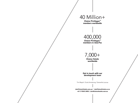 JoinChoiceHotels.com.au / JoinChoiceHotels.co.nz +61 3 9243 2400 / Join@choicehotels.com.au