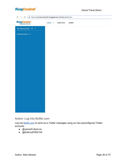 Grand Travel Demo Action: Log into Buffer.com Log into Buffer.com to send out a Twitter messages using our two preconfigured Twitter accounts: ● @JamesFultonLive ● @EdithJo97802104 Author: Alain Mowad Page 36 of 73