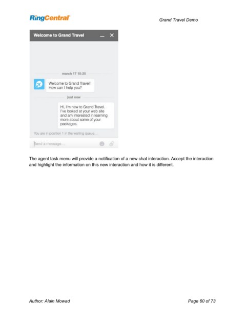 Grand Travel Demo The agent task menu will provide a notification of a new chat interaction. Accept the interaction and highlight the information on this new interaction and how it is different. Author: Alain Mowad Page 60 of 73
