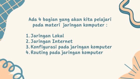 Ada 4 bagian yang akan kita pelajari pada materi jaringan komputer : 1. Jaringan Lokal 2. Jaringan Internet 3. Konfigurasi pada jaringan komputer 4. Routing pada jaringan komputer
