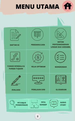 MENU UTAMA SISTEM DAFTAR ISI PENDAHULUAN PERTIDAKSAMAAN LINEAR DUA VARIABEL FUNGSI KENDALA & NILAI OPTIMUM RANGKUMAN FUNGSI TUJUAN EVALUASI PENILAIAN DIRI GLOSARIUM PETUNJUK PETA AUDIO PENGGUNAAN KONSEP STORY ii