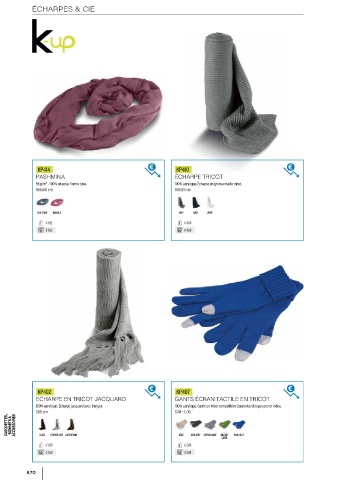 100% acrylique. Écharpe jacquard avec franges. 100% acrylique. Gants en tricot compatibles écrans tactiles pouces et index.