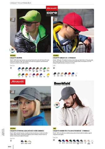 280 g/m² • 100% coton brossé. 6 panneaux avec panneau frontal renforcé, petit profil. Visière en PU recyclé 260 g/m² • 98% coton / 2% élasthanne. 6 panneaux avec panneau avant rigide. Visière en PU recyclé courbée