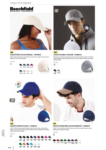 240 g/m² • 100% coton brossé, étiquette détachable tearaway, modèle 6 panneaux, visière préformée, 357 g/m² • 100% coton drill brossé, modèle 6 panneaux, visière préformée, sangle de serrage avec boucle