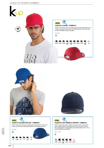 300 g/m² • 100% coton sergé. 6 panneaux. Modèle classique de première qualité. Profil bas, visière 300 g/m² • 98% coton épais brossé / 2% élasthanne. 6 panneaux. Visière mi-profil avec bords