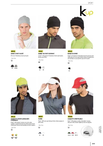 95% coton / 5% élasthanne. Bonnet sport ajusté. 220 g/m² • 92% polyester / 8 % élasthanne. Bonnet souple respirant, 180 g/m² • 92 % polyester / 8 % élasthanne. Bonnet de sport avec cache-