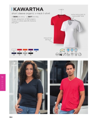 | KAWARTHA V-NECK short sleeve organic v-neck t-shirt SATIN SHOULDER TO m 38016 (XS-XXXL) f 38017 (XS-XXL) SHOULDER TAPE Single Jersey knit of 95% organic ringspun Cotton and 5% Elastane. 200 g/m2 PICK-STITCH DETAILS 01 25 33 38 44 49 95 96 99 384