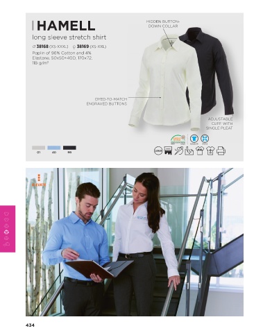 | HAMELL HIDDEN BUTTON- DOWN COLLAR long sleeve stretch shirt m 38168 (XS-XXXL) f 38169 (XS-XXL) Poplin of 96% Cotton and 4% Elastane. 50x50+40D, 170x72. 118 g/m2 DYED-TO-MATCH ENGRAVED BUTTONS ADJUSTABLE CUFF WITH SINGLE PLEAT 01 40 99 434