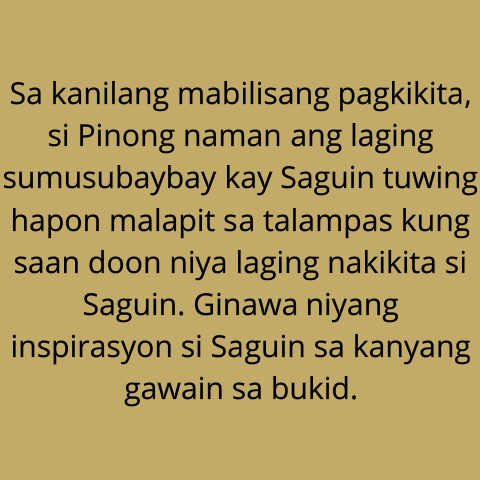 Sa kanilang mabilisang pagkikita, si Pinong naman ang laging sumusubaybay kay Saguin tuwing hapon malapit sa talampas kung saan doon niya laging nakikita si Saguin. Ginawa niyang inspirasyon si Saguin sa kanyang gawain sa bukid.